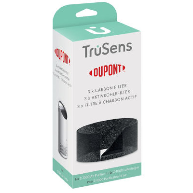 Filtre à charbon actif pour purificateur d'air Z-1000 TruSensElimine certains gaz et odeurs de l'air1er niveau de défense contre la poussière et les poils d'animauxDimensions (L x H x P) : 5 x 5 x 19,5 cmDurée de vie moyenne : 3 à 4 moisPoids : 24gConditionnement : paquet de 3