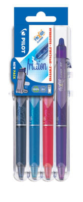 Stylo à bille roller rétractableEncre gel effaçable par friction, permet de réécrire immédiatement par-dessusStylo rechargeablePointe moyenne : 0,7 mmLargeur de trait : 0,35 mmEtui rigide de 4 couleurs assorties : Bleu nuit, Bleu turquoise, Rose et Violet.