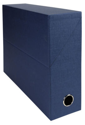Cette boîte de classement bleu foncé est dotée d'un anneau métallique sur le côté pour l'attraper facilement sur l'étagère.