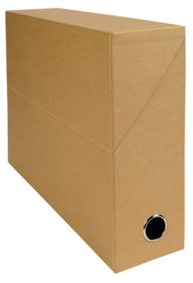 Cette boîte de classement marron est dotée d'un anneau métallique sur le côté pour l'attraper facilement sur l'étagère.