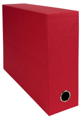 Cette boîte de classement rouge est dotée d'un anneau métallique sur le côté pour l'attraper facilement sur l'étagère.