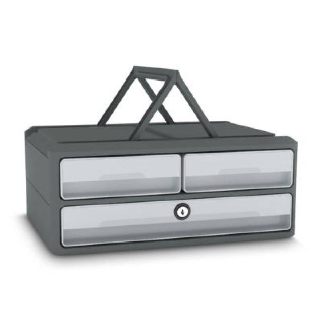 Module de classement MoovUp Secure 3 tiroirs Pour documents jusqu'au format A4+ (24 x 32 cm) Matériau : PS résistant 100 % recyclable Recyclé à 80% Serrure de verrouillage des tiroirs Dimensions : L.