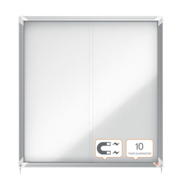 Vitrine d'affichage intérieur à fond magnétique en acier laqué blancDouble utilisation : affichage avec aimants ou écrits avec marqueur effaçable à secCadre en aluminium anodisé 2 portes coulissantes en verre sécuritéFormat : jusqu'à 12 feuilles A4Dimensions (L x H x P) : 92,5 x 97 x 6,3 cm.