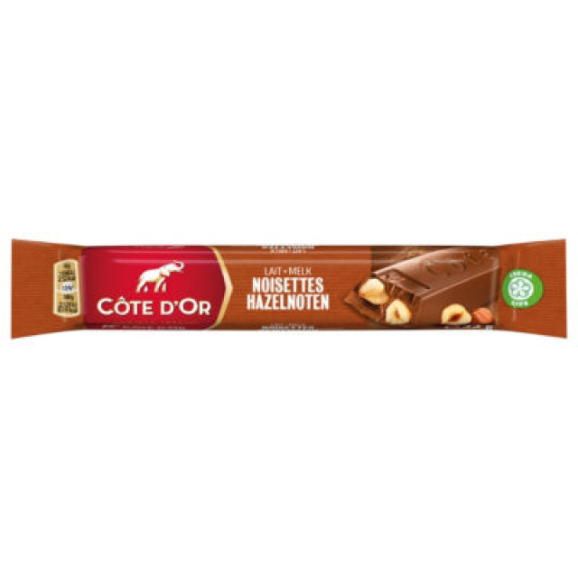 Retrouvez toute l'intensité du chocolat au lait Côte d'Or alliée au croquant de noisettes entières dans une barre individuelle avec étui refermable.