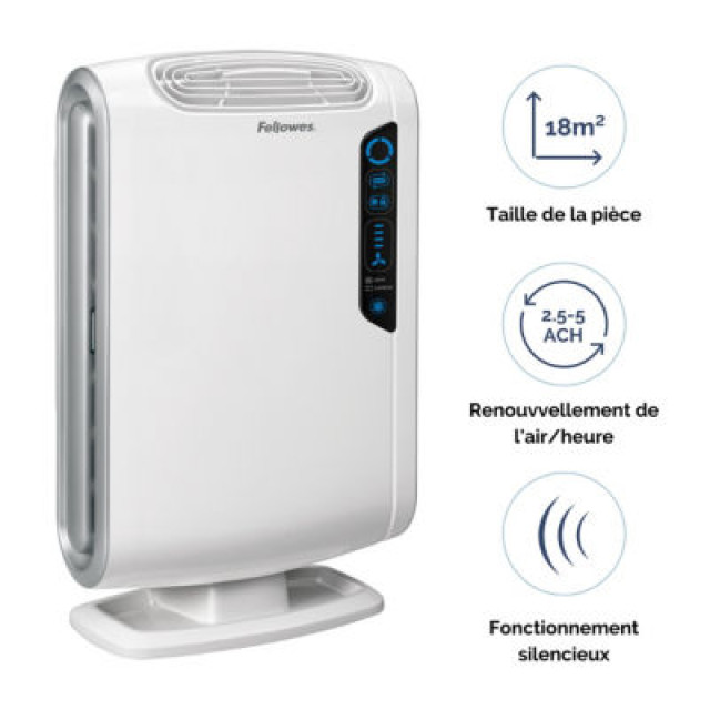 Le purificateur d'air AeraMax DX55 de Fellowes vous assure un air sain à la maison comme au bureau ! Système de purification en 4 étapes éliminant 99,97% des polluants atmosphériques et des particules aussi petites que 0,3 micron incluant les germes, virus, pollen et autres allergènes, ainsi que les acariens, les squames d'animaux et la fumée de cigarette.